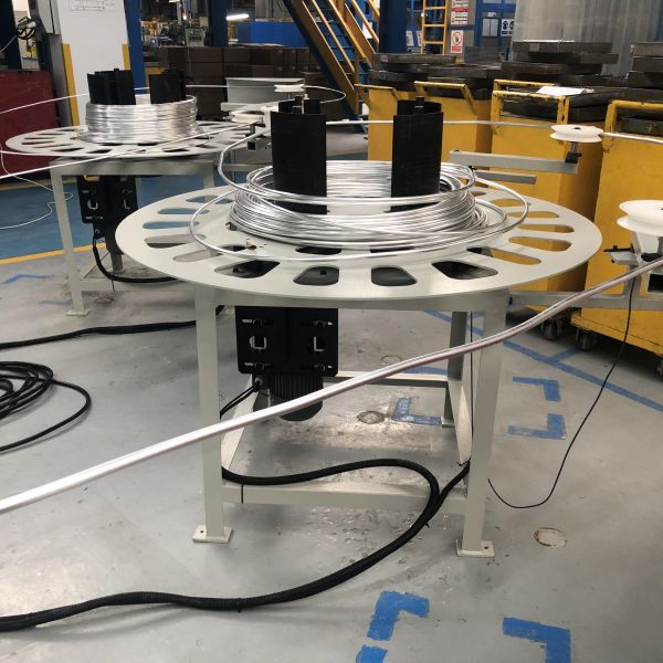 Horizontal single or multi-coil eye to sky tube uncoiler (motorized drive and brake)